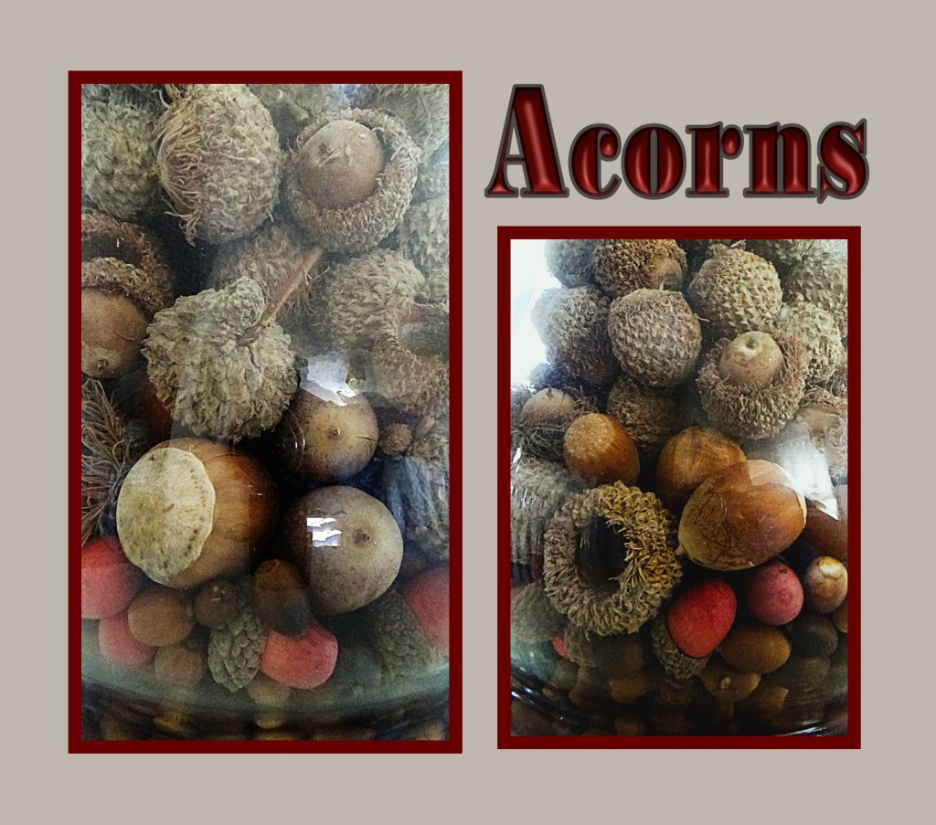 I bought a VERY old wood feeding try at a place called Jackalope. It has a lot of character and probably lots of stories to tell. It sits on an ornate iron stand and I use it for a coffee table. In the large jar are three types of acorns. The smallest ones I picked from oak brush (they are on the very bottom of the jar). The nuts from red ones are carved from a redwood, and put in natural caps. The really large ones are my pride and joy, they are among the largest acorns there are. I happened across these just after the trees had dropped them and grabbed then up as people gather these and hoard them (like me).